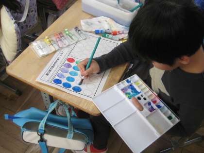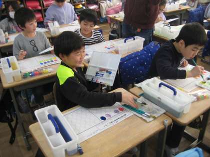 3年生が図工で絵の具の使い方の学習をしています。