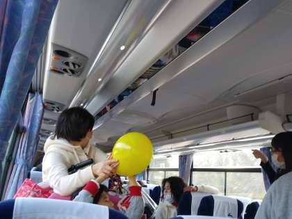 加西サービスエリアでトイレ休憩したあと出発しました。実行委員の進行でバスレクの風船送りが始まりました。
