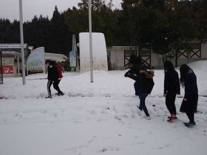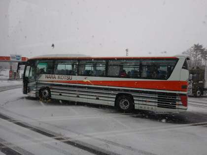 蒜山高原サービスエリアに到着しました。ボタン雪がたくさん降っています。このあと道路の雪の対応で遅れるので、休暇村からお弁当を届けてもらって、先に昼食をとっています。