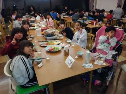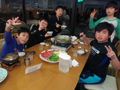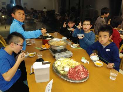 天然水の温泉で温まったあとは、まちにまった夕食です。おなかがすいて食べたすき焼きは最高でした。