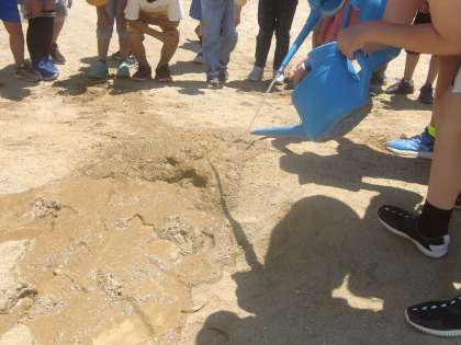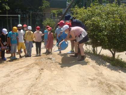 6月10日(木)、4年生は理科で「水の流れ」の実験に取り組みました。運動場の小山から、じょうろで水を流し、その流れ方を観察しました。サイズこそ実際の地形の何万分の1かも知れませんが、流れ方は基本的に同じです。豪雨による自然災害が多いだけに、4年生達のまなざしは真剣でした。