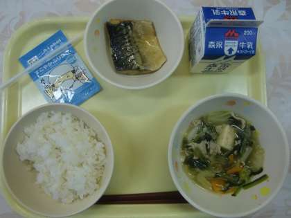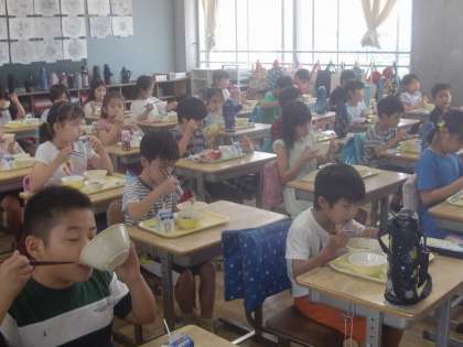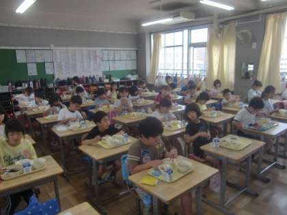 給食と言うと、カレーやスパゲッティやスープなどの洋食のイメージが強いかもしれませんが、魚の煮つけやあえものなどもよく出ます。6月18日(金)の給食メニューは、玄米ごはん、さばの煮つけ、よせなべ風、ふりかけ、牛乳です。さばの煮つけが玄米ご飯に合うことと言ったら、もう、申し分なしです。給食風景は3年生の両教室です。