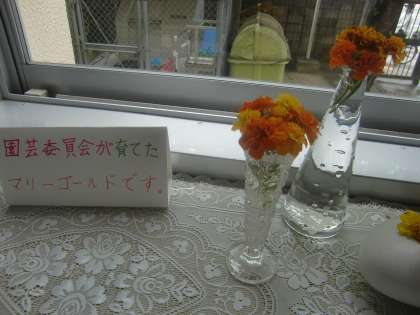 ろうかの片すみ、ロッカーの上にマリーゴールドの一輪ざしが飾られていました。横には「園芸委員会で育てたマリーゴールドです」と書かれています。ふと、目に留まった花の美しさ以上に、本校の子ども達の豊かな気持ちに『またひとつ本校のいいところを見つけた』と一人、悦に入る校長です。