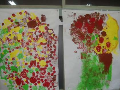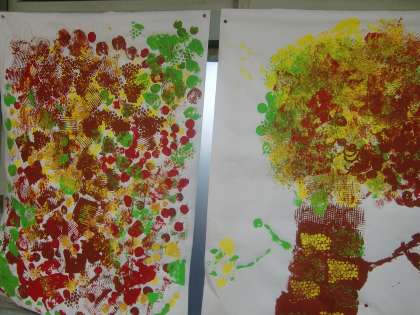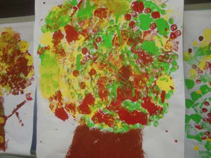 11月2日(火)、さくらは「おいでよ!さくらの森」に取り組みました。秋たけなわのこの日、さくらの森では、木々に食べごろのたくさんの果実が実りました。果実の正体はスタンピングです。スタンプ押しで、色々な果実を表現したのです。収穫の秋、桜の森の大豊作をご覧ください。