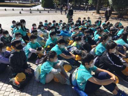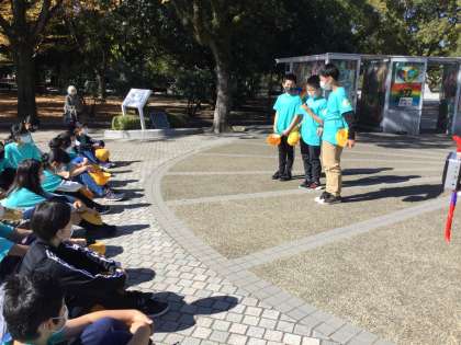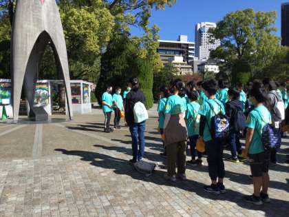 原爆の子の像の前で、平和セレモニーを行いました。黙祷のあと、住道南小学校の児童の願いを込めた千羽鶴を捧げました。「広島のある国で」を全員で静聴した後、誓いの言葉を述べました。心引き締まる思いがしました。