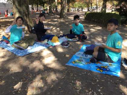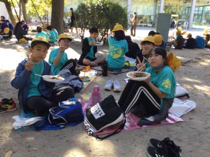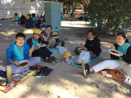 お昼ご飯は、大きな広島焼きです。甘口ソースをかけて、とても美味しかったです。仲間と一緒に食べると味も格別です。