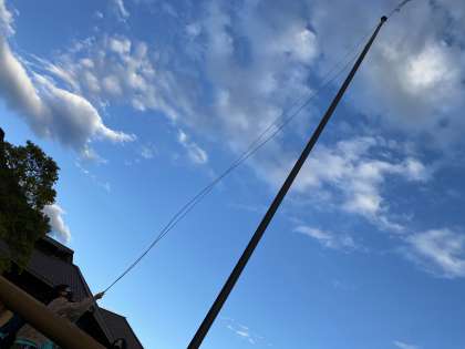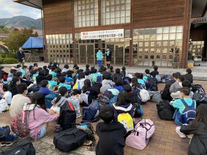 無事、県民の浜「輝きの館」に到着しました。横断幕とスタッフの方に出迎えられみんな笑顔です。学年の旗も靡いています。