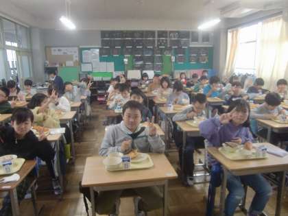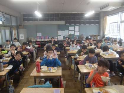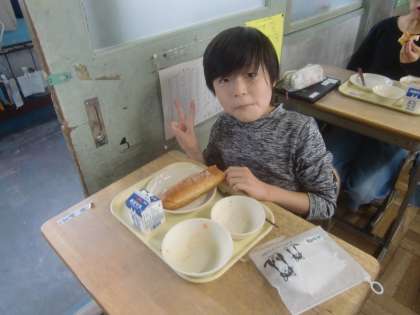 11月9日(火)の給食メニューは、あげパン、ようふうおでん、大豆の華サラダ、和風ドレッシング、牛乳です。今日は不動の人気メニュー「あげパン」の登場です。中には、じっくりとあげパンを味わうために、おでんとサラダを先に平らげる子もいるようです。写真は5年生の両教室の給食風景です。6年生修学旅行の代休で少し寂しい今日の住南小ですが、次期リーダーの5年生達が居るので、どうぞご心配なく!
