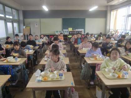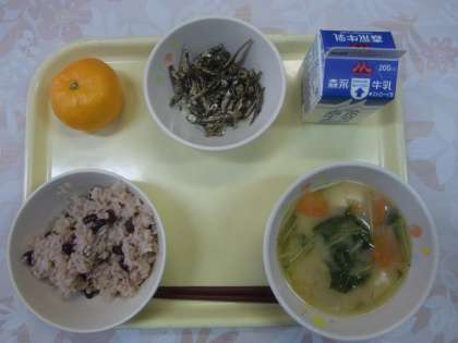 1月12日(水)の給食メニューは、赤飯、ぞう煮、田作り、みかん、牛乳です。祝い膳、お正月メニューの登場です。新学期最初の給食とあって、楽しみにしていた子も多いと思います。いっぱい食べて、午後の授業もがんばりましょう!