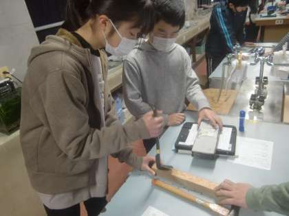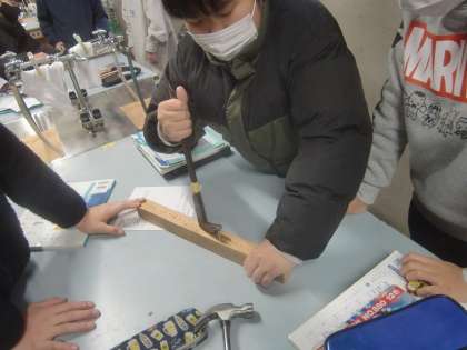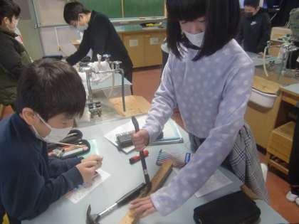 1月14日(金)、6年生は理科で「てこの原理」に取り組みました。『木に深く打ち込んだくぎを指で引き抜く!』・・・至難の業でしょう。ところが、くぎ抜きを使うと造作なく抜くことが出来ます。小さい力を大きな力に変える、てこの原理を体感する6年生達に『おお〜』という感嘆の声が小さくあがります。