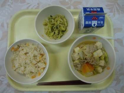 1月17日(月)の給食メニューは、シーチキンごはん、やっこ煮、ごまあえ、牛乳です。あっさりとしたシーチキンごはんと、あったか「やっこ煮」、そしてごまの風味豊かなごまあえに大満足です。さて、ここの教室では給食待ち時間に、静かにビデオを観たりしています。おだやかな昼のひと時です。