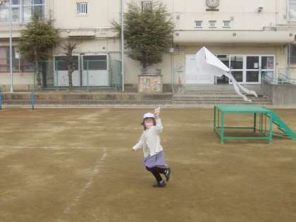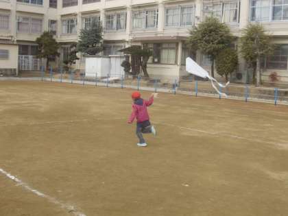 1月20日(木)、1年生は生活で「たこたこあがれ」に取り組みました。(標題は取材の校長が勝手につけたもので実際の標題とは関係ありません)『このたこをあげたいな!あがるかな?』期待と不安が交錯するなか、次々と走り出します。『やったあ!あがった!』冬の風物詩「たこあげ」に一生懸命に取り組む1年生達です。