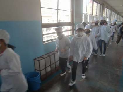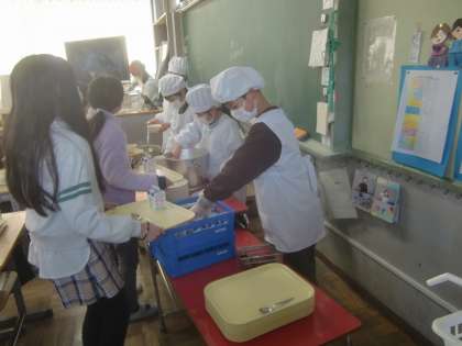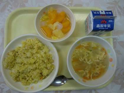 1月24日(月)の給食メニューは、カレーピラフ、たまごスープ、フルーツナタデココ、牛乳です。今日は、カレーはカレーでも、ちょっと趣向を変えたカレーピラフの登場です。スパイシーなカレーと、甘いフルーツナタデココ、それに温かいたまごスープとくれば、美味しいに決まってます。『いただきます』