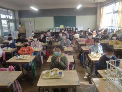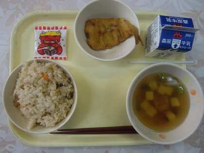 2月3日(木)の給食メニューは、かやくごはん、すまし汁、いわしフライ、ふくまめ、牛乳です。言わずと知れた節分メニューの登場です。時下、コロナ禍ということで、『コロナが終息しますように!』と願いつつ『いただきます』