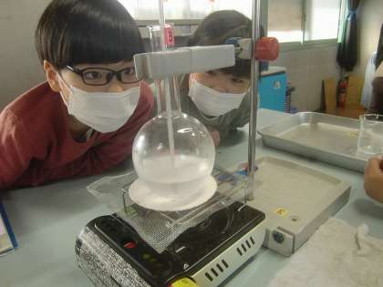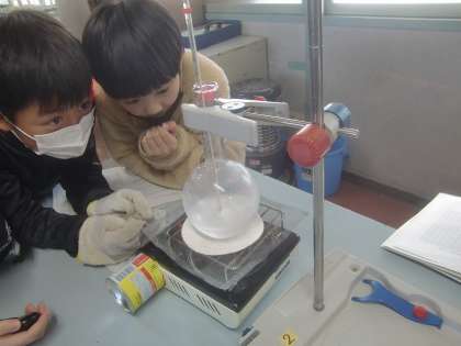 2月4日(金)、4年生は理科で「水を熱し続けるとどうなるのだろう?」に取り組みました。最近は塾などでも実験室を併設している所もありますが、大きな理科室と備品を持つのは、学校ならではの長所の一つです。2分ごとに丸底フラスコに取り付けられた温度計を測定する4年生達の目が輝いています。