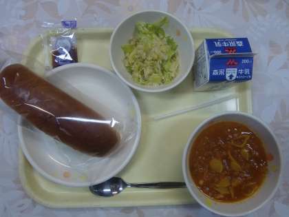 3月1日(火)の給食メニューは、黒糖パン、チリコンカーン、大豆の華サラダ、和風ドレッシング、牛乳です。はて?チリコンカーンとは?実は、アメリカでは定番の料理で、牛ひき肉と玉ねぎを炒め、トマト、ピーマン、豆の水煮(インゲン豆等)、チリパウダーなどを加えて煮込んだものです。給食人気メニューの1つです。『いただきます』