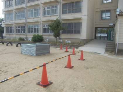10月11日(火)、いよいよ長寿命化工事が始まりました。工事の着手は搬入搬出路兼重機・資材置き場の設置からです。運動場の西側半分がフェンスで仕切られます。住南っ子のみなさんはフェンスに触らないようお願いします。1年半の長い工事に入ります。不都合、不便等、多々あろうかと思いますが、快適な未来のための工事に何卒、ご理解をお願いいたします。(ジャングルジムうんていは使えるようフェンスを下げています。)