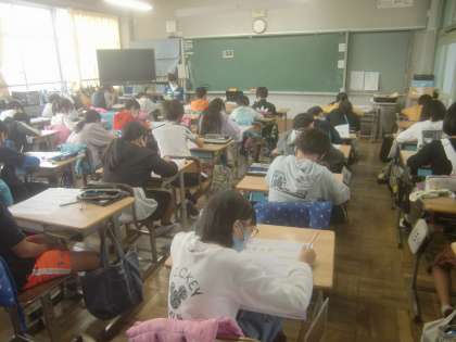 5年生の教室前を歩いていても、物音ひとつしないので『体育とかなのかな?』と思いながらのぞいてみると、何と「テスト時間」でした。5年生達は静かにテストに取り組んでいました。心の中で『邪魔してごめんね。1枚だけ撮らしてね』と言いつつ、そそくさと退出しました。真剣にテストに取り組む5年生に感心しました。
