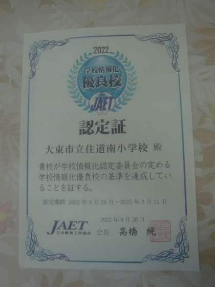 10月12日(水)、JAET:日本教育工学協会より、本校を「学校情報化優良校」とする認定証が届きました。認定期間は2022年9月26日〜2025年3月31日までです。大変名誉なことであり、子ども達、保護者様、地域の皆様と一緒に認定を喜ぶとともに、今後も、ICT機器を活用した教育の充実に努めて参ります。「優良校認定おめでとう!住道南小学校!」