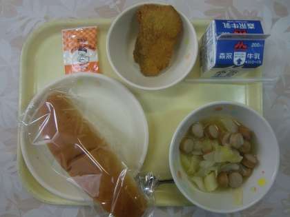 10月13日(木)の給食メニューは、コッペパン、じゃがいものスープ煮、サーモンフライ、ミルクバター、牛乳です。今日のじゃがいものスープ煮に使われているじゃがいもの品種は、美味しくて栄養価の高い「メークイーン」だそうです。感謝の気持ちを込めて『いただきます』