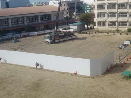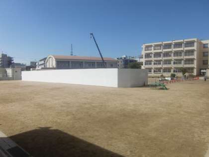 長寿命化工事に伴い、運動場の西側半分が資材置き場等になります。したがって、子ども達は運動場東側を利用します。運動場を東西に隔てるフェンスは、ボール等がぶつかっても倒れたりしないよう、高さが3mもある丈夫なものにしてもらっています。運動場の様子を写真でお届けします。