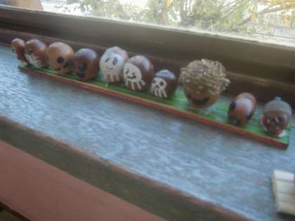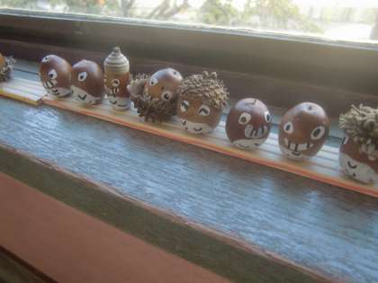 写真は、1年生のろうか横に飾られた「どんぐり芸術」です。察するに、どんぐりは過日の「寝屋川公園への校外学習」で拾ったものでしょう。地面に落ちていたあのどんぐりが、今や立派な芸術作品です。お見事です!1年生!