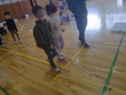 11月11日(金)、3年生は総合で「バリアフリー教室」に取り組みました。実際にアイマスクを付けて歩いたり、車いすに乗ったりする体験授業です。黒板と机では体感できない学びに、一生懸命の3年生でした。今回、子ども達に貴重な学習機会を与えていただいた関係諸団体の皆様に心よりお礼申し上げます。