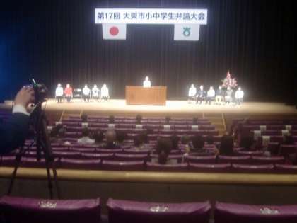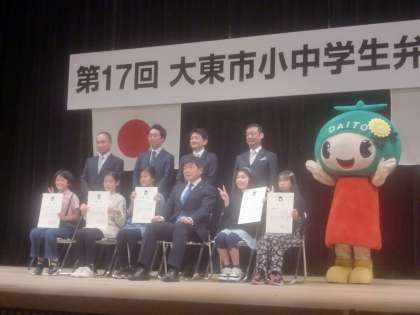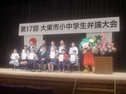 11月11日(金)、サーティホール大会場で第17回大東市小中学生弁論大会が盛大に開催されました。オンラインで友達や先生が応援する中、本校からは6年生と5年生の各1名が出場し、その堂々たる弁論と1分間スピーチに盛大な拍手が送られました。大会終了後は大東市長を囲んで記念撮影を行いました。出場者も応援のみんなも実にあっぱれな弁論大会でした。子ども達にこのような学びの機会を与えてくださった本市関係者の皆様に心よりお礼申し上げます。