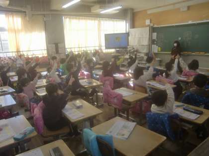 12月5日(月)、1年生は国語で「漢字の空書き」に取り組みました。先生に合わせて空中に漢字を書くことで、正しい漢字の書き方や筆順を習得できます。ただ、ラジオ体操などもそうなのですが、先生は左右を反転して、鏡に映したように書かなければなりません。がんばれ!先生!