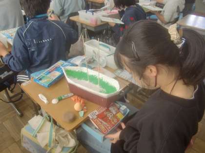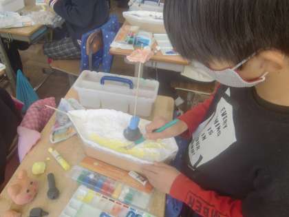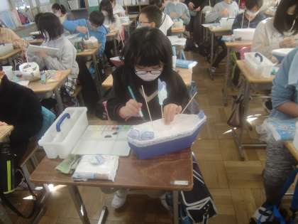 12月5日(月)、6年生は図工で「オリジナル船」に取り組みました。(標題は参観の校長が付けたもので実際の標題とは関係ありません)紙粘土等で作った船の着色の様です。唯一無二のオリジナル船の完成が楽しみです。