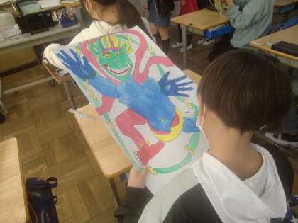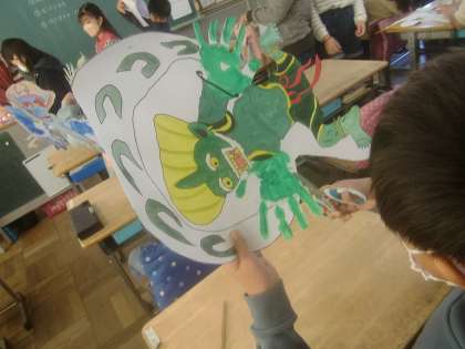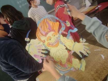12月8日(木)、5年生が図工で取り組んでいる「風神・雷神」が完成に近づきつつあります。完成作品は、迫力ある「風神・雷神」になるようです。その一端を写真でお届けします。