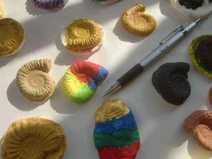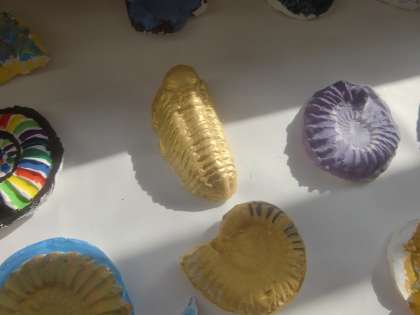 12月8日(木)、6年生は理科で「オリジナル化石づくり」に取り組んでいます。本物の化石を粘土で形どりして作ったオリジナル化石です。着色は自由ということで奇想天外な色の生物が出現しています。古代・・・実際の色は不明ですので、案外、正解かも知れません。