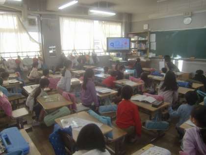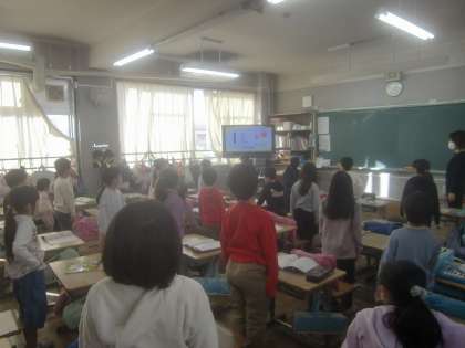 12月9日(金)、2年生は外国語活動で「English」に取り組みました。子ども達は手慣れたもので、テレビに合わせて発音したり、体を動かしたりしています。とても楽しく「English」を学ぶ、2年生の様子を写真でお届けします。