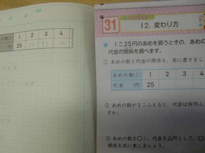 12月13日(火)、4年生は算数で「変わり方」に取り組みました。1こ25円のあめを買う時の、個数と代金の関係を表にします。すると、実に規則正しい変わり方をすることに気が付きます。数学で言うところの比例の考え方を身に付ける4年生です。
