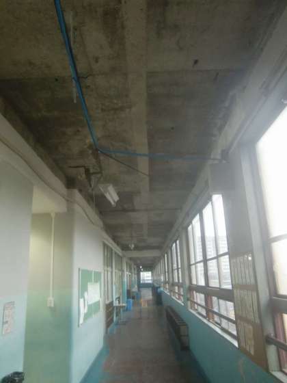 2月より着手予定の2期工事に先がけ、4階の天井がはがされ、写真の様に、むき出しになっています。配線等が落ちたりしないように安全第一で進めてもらっていますが、ちょっとびっくり感があるかとも思います。教育活動と並行して長寿命化工事を進める本校です。