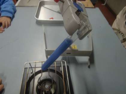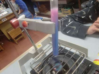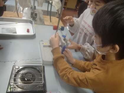 1月16日(月)、4年生は理科で「ものの温まり方」に取り組みました。試験管の中の水は、示温インクであらかじめ青色に着色しています。試験管の底部分を熱しているのに、温度が上がったのは(=ピンク色に変色したのは)試験管の上部です。摩訶不思議なものの温まり方に驚きの4年生です。