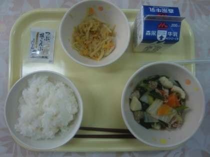 1月19日(木)の給食メニューは、ごはん、寄せ鍋風、大根の炒め煮、塩こんぶ、牛乳です。コンロ上ではないゆえ、寄せ鍋風となっていますが、事実上の寄せ鍋です。温かく、具沢山な鍋にほっこりです。美味しく栄養豊かな給食に感謝の気持ちを込めて『いただきます』
