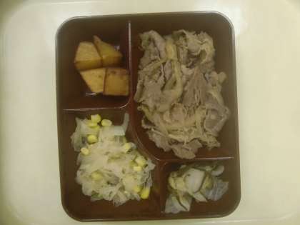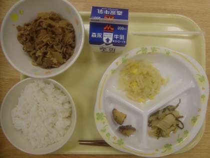 10月10日(火)の給食メニューは、ごはん、牛丼(ごはんにかける)、白菜の塩昆布和え、キャベツとコーンのさっと煮、大学芋、牛乳です。今日は、食欲の秋にピッタリのメニュー、牛丼の登場です。写真は献立盛り付け(写真上)と、アレルギー対応のお弁当です(写真下)。美味しく栄養豊かな給食に感謝の気持ちを込めて「いただきます」