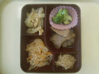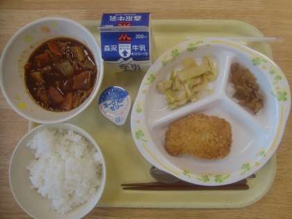 10月13日(金)の給食メニューは、ごはん、ポークカレー、白菜と油揚げのお浸し、エビカツ、福神漬、ヨーグルトゼリー、牛乳です。カレーの登場に、カレー好きの児童は大喜びでしょう。写真は献立盛り付け(写真上)と、アレルギー対応のお弁当です(写真下)。美味しく栄養豊かな給食に感謝の気持ちを込めて「いただきます」