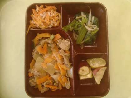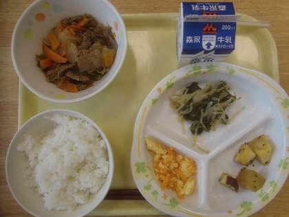11月1日(水)の給食メニューは、ごはん、焼肉炒め、ほうれん草の和え物、にんじんしりしり、大学芋、牛乳です。今日は、お肉たっぷりの焼肉炒めの登場です。写真は献立盛り付け(写真上)と、アレルギー対応のお弁当です(写真下)。美味しく栄養豊かな給食に感謝の気持ちを込めて「いただきます」