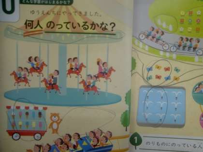 問題です。「回転木馬が5台あります。1つの回転木馬に2人がのっています。全部で何人のっているでしょう?」もちろんのっている人を数えるという解答もありますが、5×2=10という計算式を見出したいです。「九九」の習得と文章題に挑む2年生です。