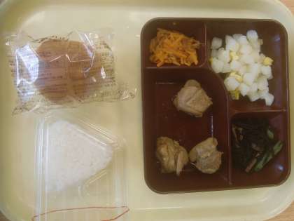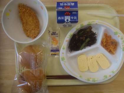 11月16日(木)の給食メニューは、ロールパン、白身魚フライ、だし巻き卵、ひじき煮、人参の和風炒め、タルタルソース小袋、牛乳です。今日は、タルタルソースが効いた白身魚フライの登場です。写真は献立盛り付け(写真上)と、アレルギー対応のお弁当です(写真下)。美味しく栄養豊かな給食に感謝の気持ちを込めて「いただきます」