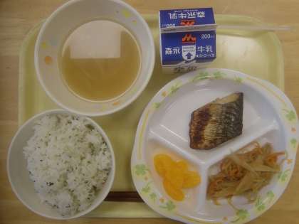 11月20日(月)の給食メニューは、菜めし、サバの柚子風味焼き、きんぴらごぼう、中華スープ、みかん缶、牛乳です。今日は、脂ののったサバの柚子風味焼きの登場です。写真は献立盛り付け例です。今日は、アレルギー対応のお弁当はありません。美味しく栄養豊かな給食に感謝の気持ちを込めて「いただきます」