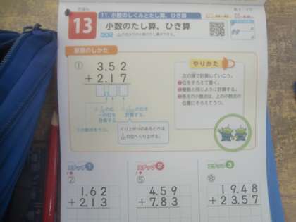 11月21日(火)、4年生は算数で「小数のたし算ひき算」に取り組んでいます。この単元の最大のポイントは「位取り」にあります。位をそろえて筆算を組み、問題に挑む4年生です。