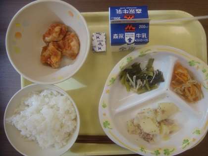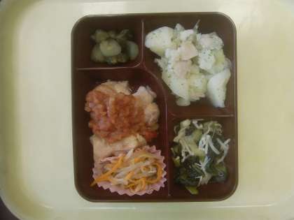 11月22日(水)の給食メニューは、ごはん、鶏肉のトマトオニオンソース、ジャーマンポテト、小松菜の煮びたし、もやしと人参の和え物、チーズ、牛乳です。今日は、鶏肉のトマトオニオンソースの登場です。写真は献立盛り付け(写真上)と、アレルギー対応のお弁当です(写真下)。美味しく栄養豊かな給食に感謝の気持ちを込めて「いただきます」
