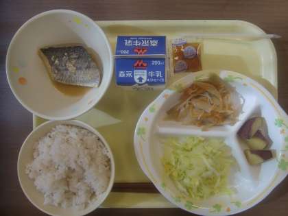 12月14日(木)の給食メニューは、梅ごはん、サワラのみそ煮、きんぴらごぼう、キャベツサラダ、さつま芋炊き、青じそドレッシング小袋、牛乳です。今日は、脂ののったサワラの登場です。写真は献立盛り付け例です。今日はアレルギー対応のお弁当はありません。美味しく栄養豊かな給食に感謝の気持ちを込めて「いただきます」