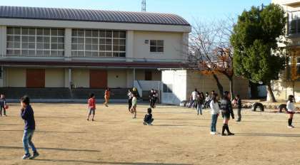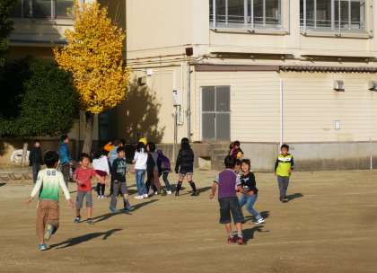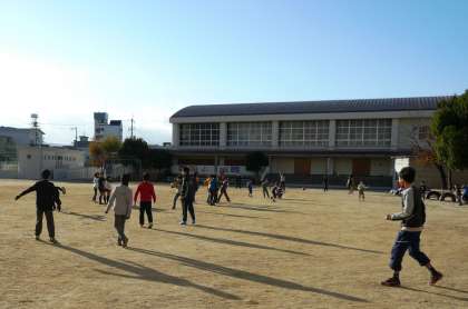 ボールを持って運動場に飛び出して、西の端まで走ってきます。ここでボール遊びをします。
