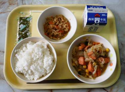 メニューは、ちゃんちゃん焼き、大根の炒め煮、ごはん、のり、牛乳。