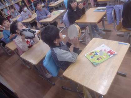 1月10日(水)、1年生は音楽で「♪に合わせて、リズム打ち」に取り組みました。タンバリン、すず、カスタネット、トライアングル・・・。楽器は違えど、♪にピタリと合わせた見事な演奏でした。教室が楽しさに包まれていました。