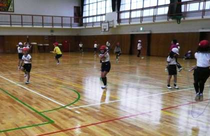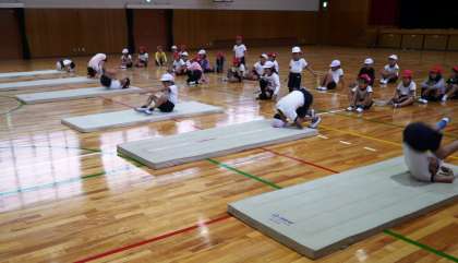 1時間目 体育 縄跳とマット運動。「両手をしっかりついて!」担任の先生の指示を聞いて前転に挑戦しています。